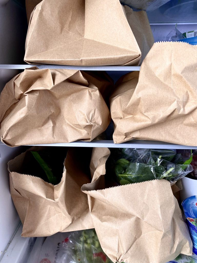 Le livreur Chonopost viendra toquer à votre porte avec le colis réfrigéré. Je vous conseille de vérifier chaque recette et les ingrédients reçus pour ne pas avoir de surprise. J’ai eu une mésaventure dans ma première box, je vous en parle plus bas. Les recettes sont compartimentées dans des poches kraft ce qui permet de les ranger directement dans le frigo. Bon, souvent elles se sont mélangées pendant le transport mais il arrive qu’elles soient trés bien rangées dans le colis.