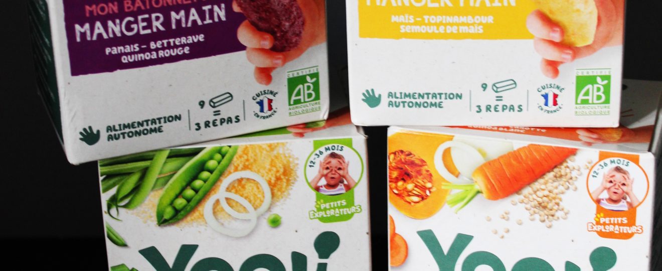 Voilà quelques mois que le ptit canaillou a débuté la diversification alimentaire. Il mange désormais des purées mais aussi des légumes ou des fruits en morceaux. En journée il mange aussi des biscuits, des « cracottes » ou un quignon de pain. Nous lui donnons à manger à la cuillère ( même s’il essaie de se donner à manger tout seul ) et nous le laissons également découvrir avec ses mains les aliments. Nous faisons une petite DME ( Diversification alimentaire Menée par l’Enfant ). Cela lui plaît bien. Après avoir testé les portions de viandes de chez Yooji, nous avons testé les bâtonnets de légumes et féculents chez Yooji aussi.